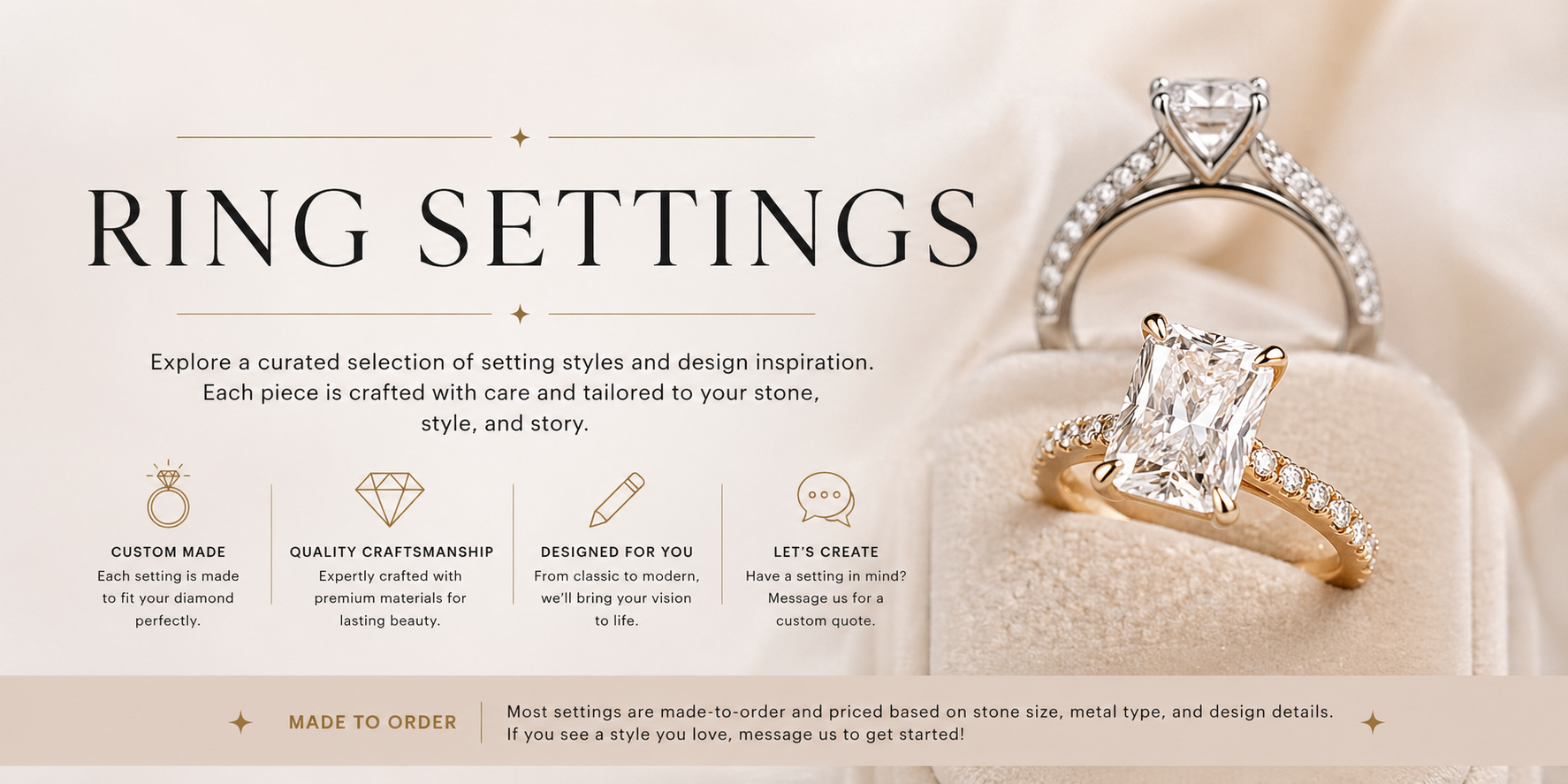 Browse setting inspiration and available styles. Most settings are made-to-order and priced based on stone size, metal type, and design details. If you see a style you like, message us for a quote.